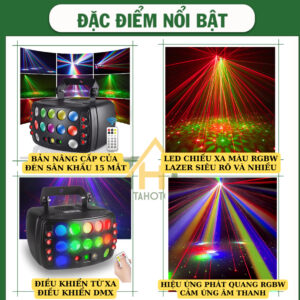 hiệu ứng chấm laser. Đó là một loại đèn siêu giá trị với nhiều hiệu ứng ánh sáng đầy màu sắc có thể đáp ứng việc sử dụng trong các dịp khác nhau. - Chùm sáng rực rỡ kết hợp ánh sáng đầy sao màu đỏ và xanh lục, cùng với hiệu ứng đèn LED nhấp nháy và chấm đỏ sẽ làm cho sân khấu, bữa tiệc hoặc vũ trường của bạn trở nên thú vị hơn bất ngờ.